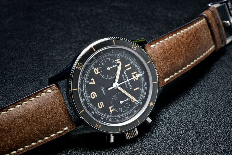 Other nice touches of the 2019 version include the same “Air Command” script under the Blancpain logo, and the same font used for the Arabic numerals, which are covered with orange hued Super-LumiNova®, meant to evoke the look of the faded radium lume of the original.