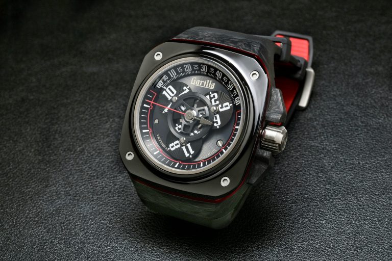 At 44mm wide case, and 14mm high, it carried the attractive and well defined design language of the Gorilla watch brand, being large, squarish and bold, with exposed screws on the ceramic bezel atop a case of layered carbon composite and a motorsport inspired colour scheme coming from red anodised aluminium and titanium.