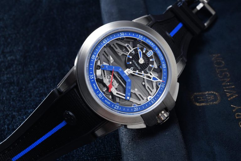Also echoing the history of the brand is the recurring theme of the octagon, with the exposed bridges forming this shape, along with the Harry Winston logo – reportedly this is because Harry Winston himself preferred the emerald cut, hence the octagonal shape motif that continues across its designs. The case measures 42.2mm in diameter, and is mounted on an integrated rubber strap with textile texturing, and secured with an ardillon buckle made of Zalium with folding security clasp.