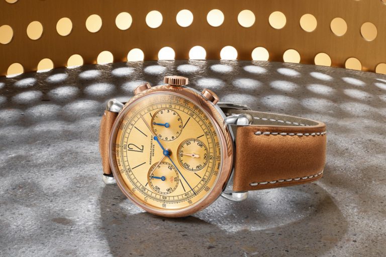 The old bits that are retained in the new [Re]master01 include the stainless steel case and lugs, that are contrasted by the bezel, olive- shaped pushers and chamfered crown in 18-carat pink gold. On the wrist, the teardrops lugs in stainless steel differ from the gold colour of everything else visible, which is a nice contrast. The satin-brushed gold-toned dial enriched with black transferred hour-markers, pink gold hour, minute and seconds hands, blue chronograph hands and a blue transferred tachymetric scale is similarly faithful to the original and strikingly charming.